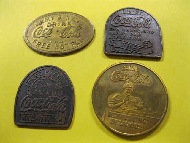 COCA COLA: THREE METAL TOKENS AND ONE 75TH ANNIVERSARY COIN