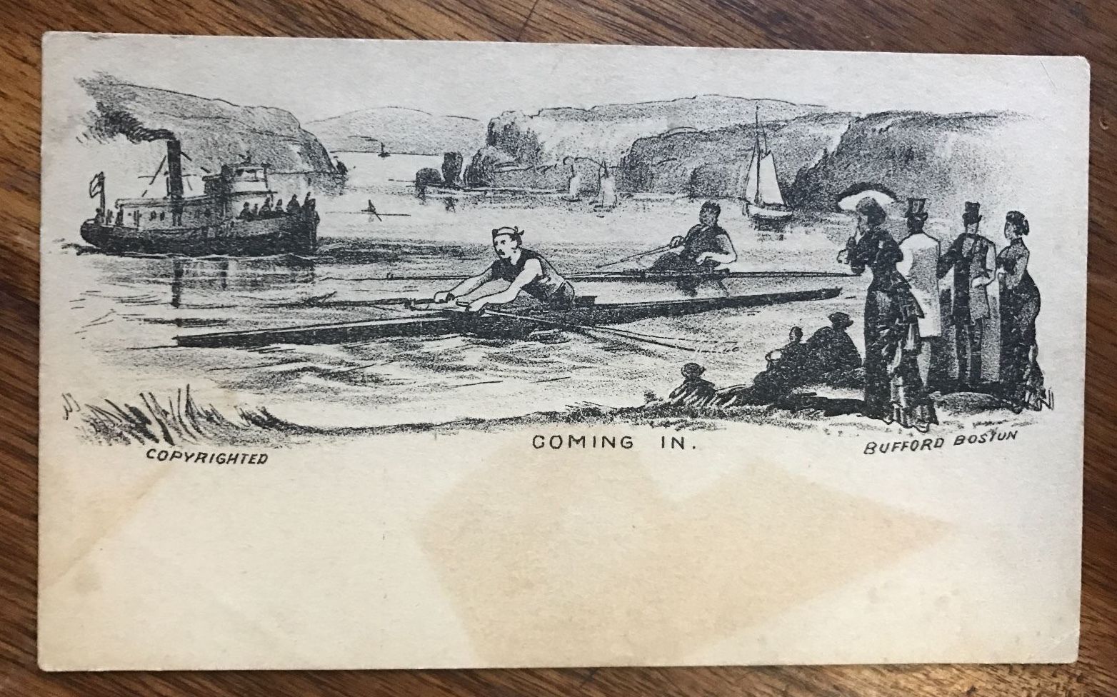 Coming In 1880 victorian trade card Caricature - Kayak Race Bufford Boston /B11