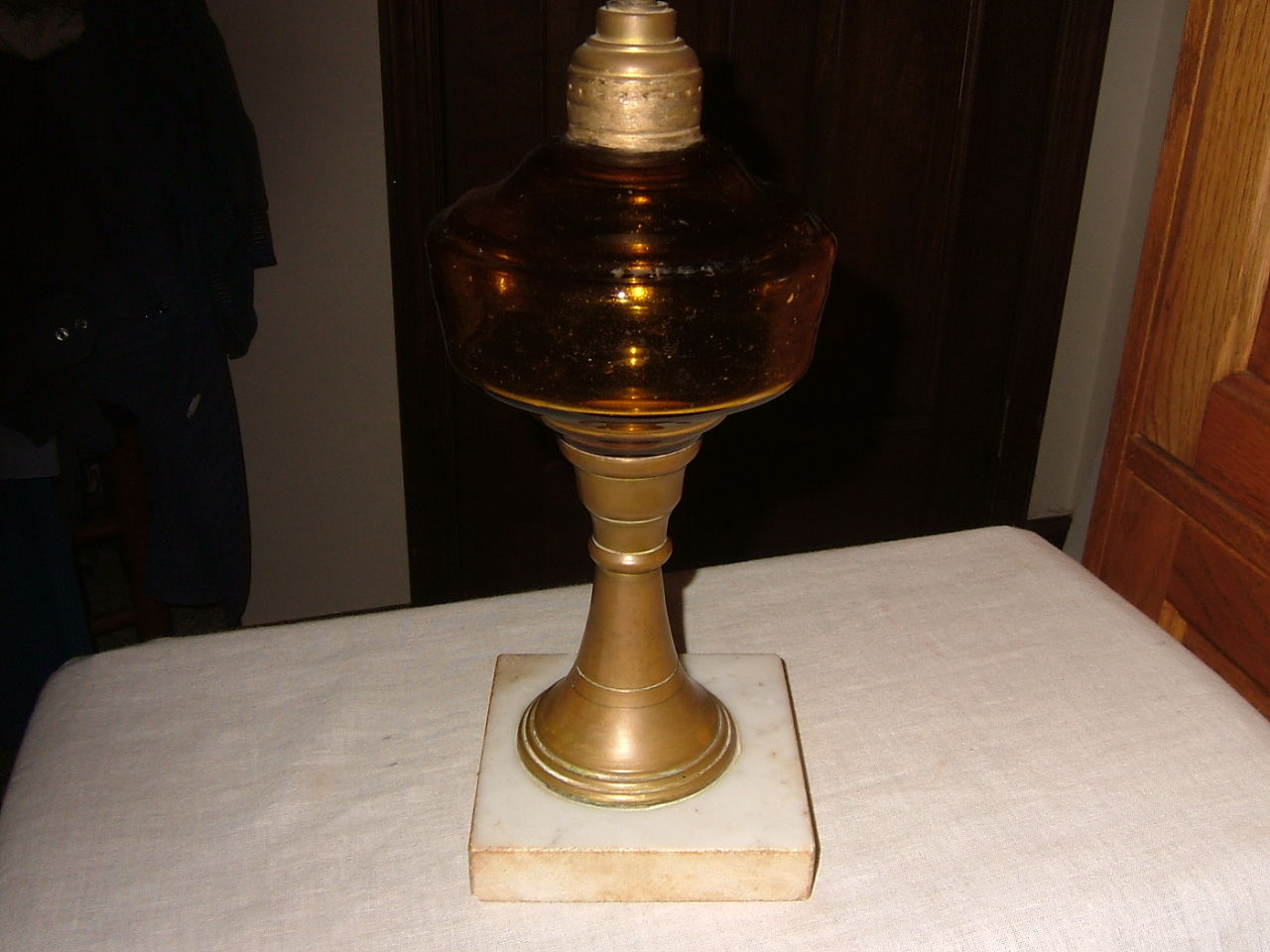 Antique, Amber Glass, Brass & Marble Whale Oil Lamp, Mid 1800''s