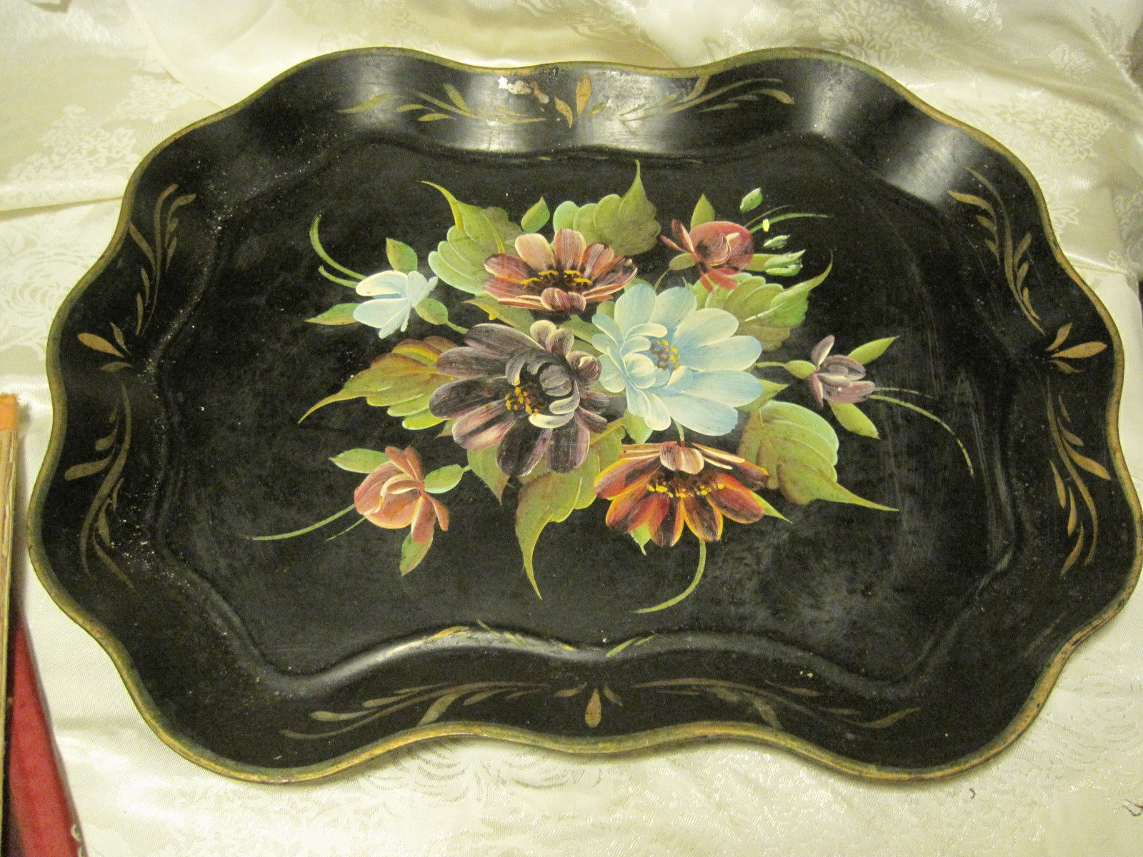 Title (ebay affiliate link): Vtg E T NASH CO Toleware Hand Painted Tole Metal Tray Large 17x14" FLORAL Design