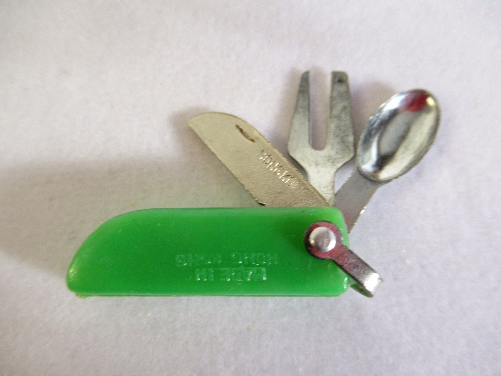 RARE! TINY 1" VINTAGE 3 METAL UTENSIL FOLDING KNIFE/FORK/SPOON CRACKER JACK TOY