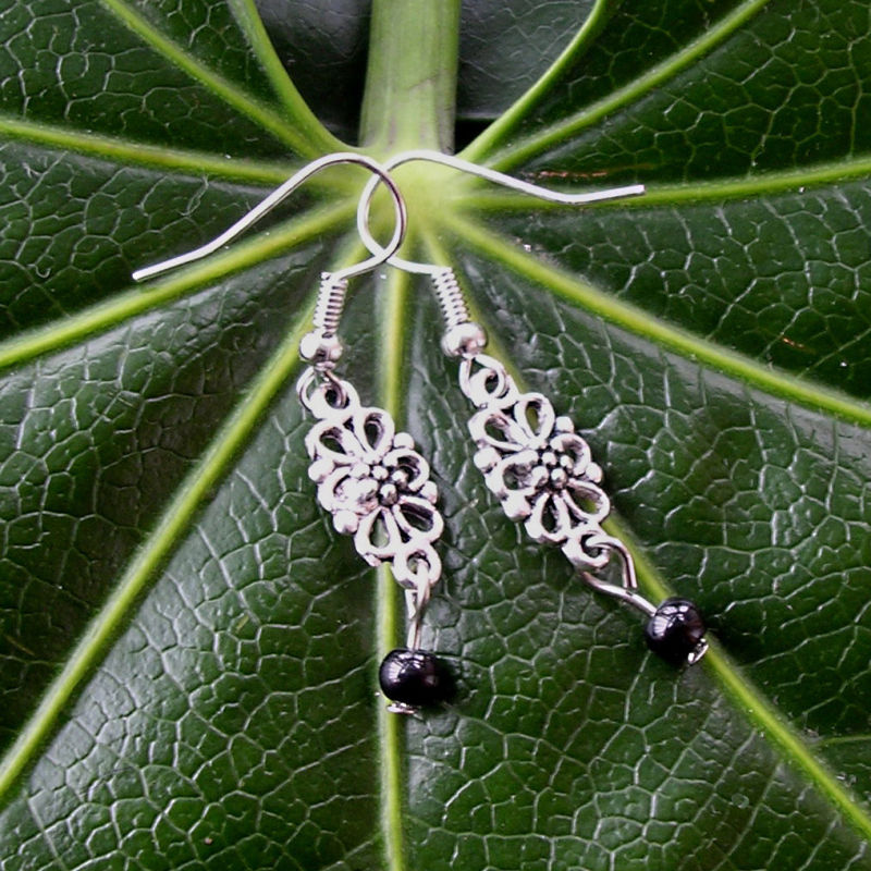 Title (ebay affiliate link): Vintage Antique Silver Cutout Flower Black Bead Drop/Dangle Hook Earrings L- 4cm