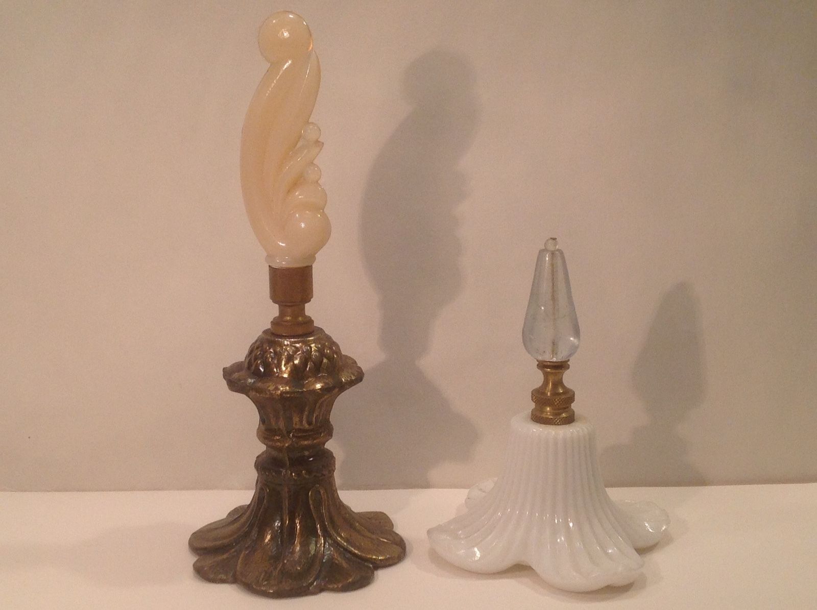 STUNNING GLASS LAMP FILIALS- ONE ON BRASS BASE ONE ON PRESSED GLASS- MUST SEE!!!