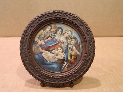 Round Wood Table Top Picture Frame Cut Postcard of Madonna & Child Antique