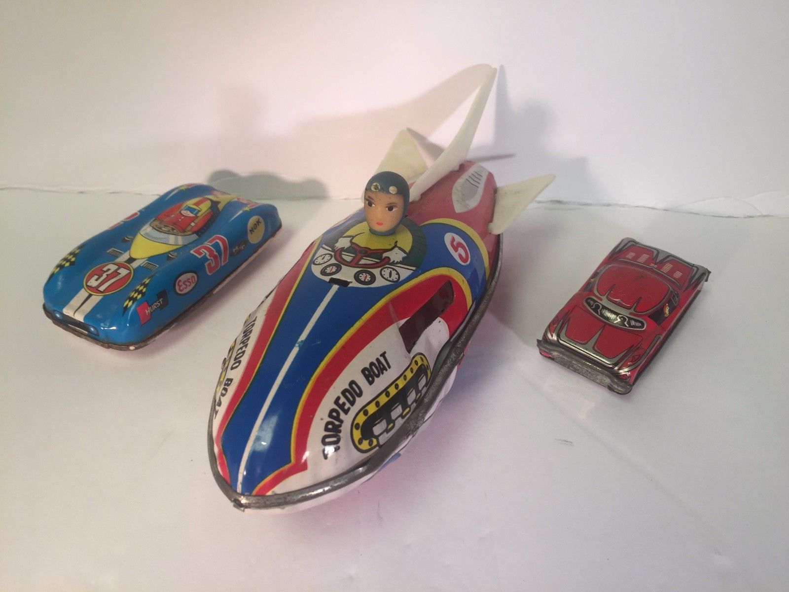 Title (ebay affiliate link): COSMIC TORPEDO BOAT TIN TOY MF 923 with another 2 random tin toys