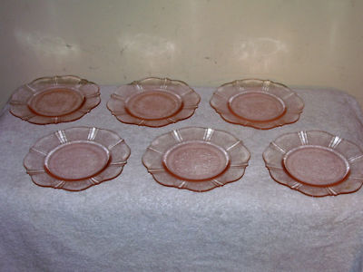 Title (ebay affiliate link): 6 Pink Depression glass pressed design dessert plates
