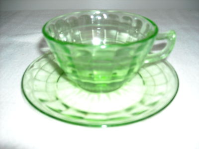 GREEN DEPRESSION GLASS BLOCK OPTIC CUP/SAUCER-1929-33