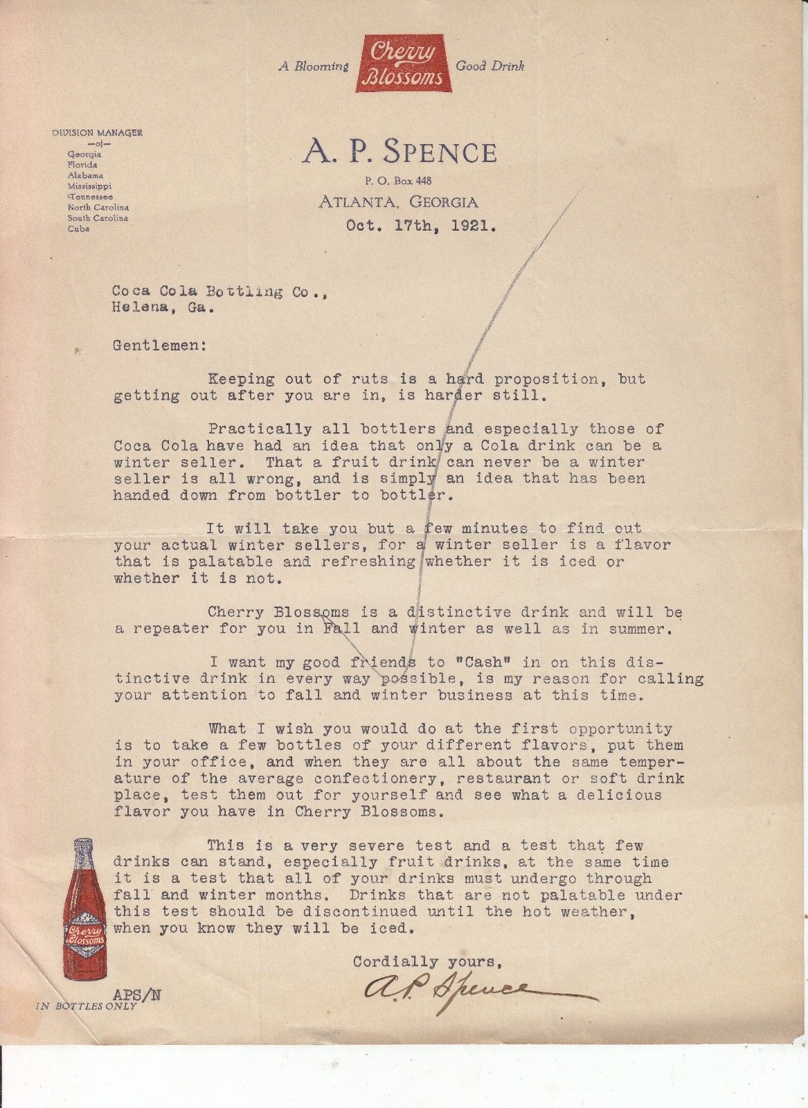 CHERRY BLOSSOMS A. P. SPENCVE LETTERHEAD ATLANTA GA. Dated Oct. 17th, 1921