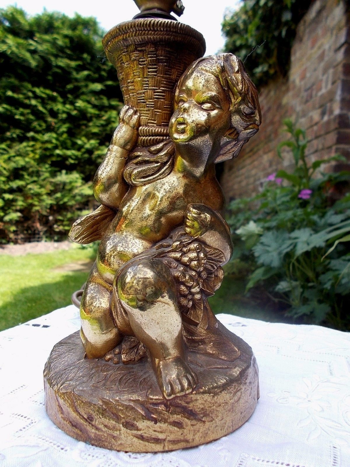 Title (ebay affiliate link): VINTAGE GILT METAL TABLE LAMP~LIGHT BASE~CHERUB FIGURE WITH A BASKET~SHABBY CHIC