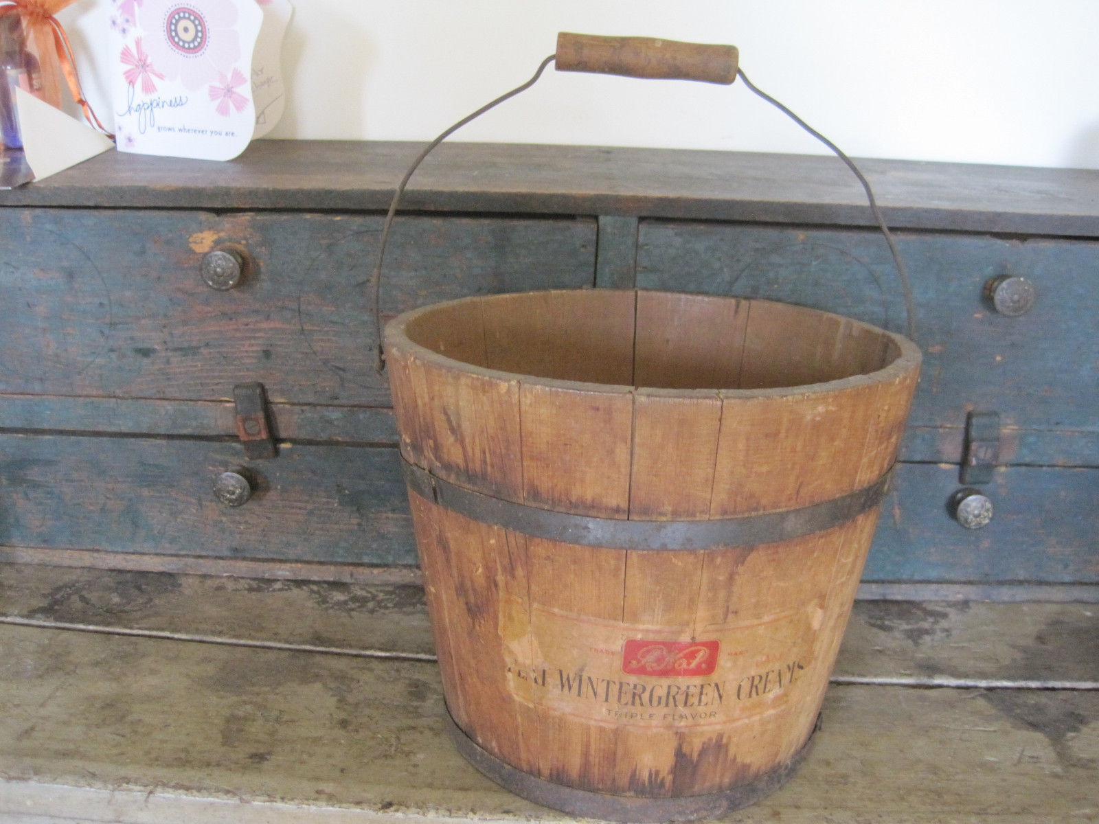Title (ebay affiliate link): Old Primitive Original Paper Label Primitive Bail Handle Wood American Bucket