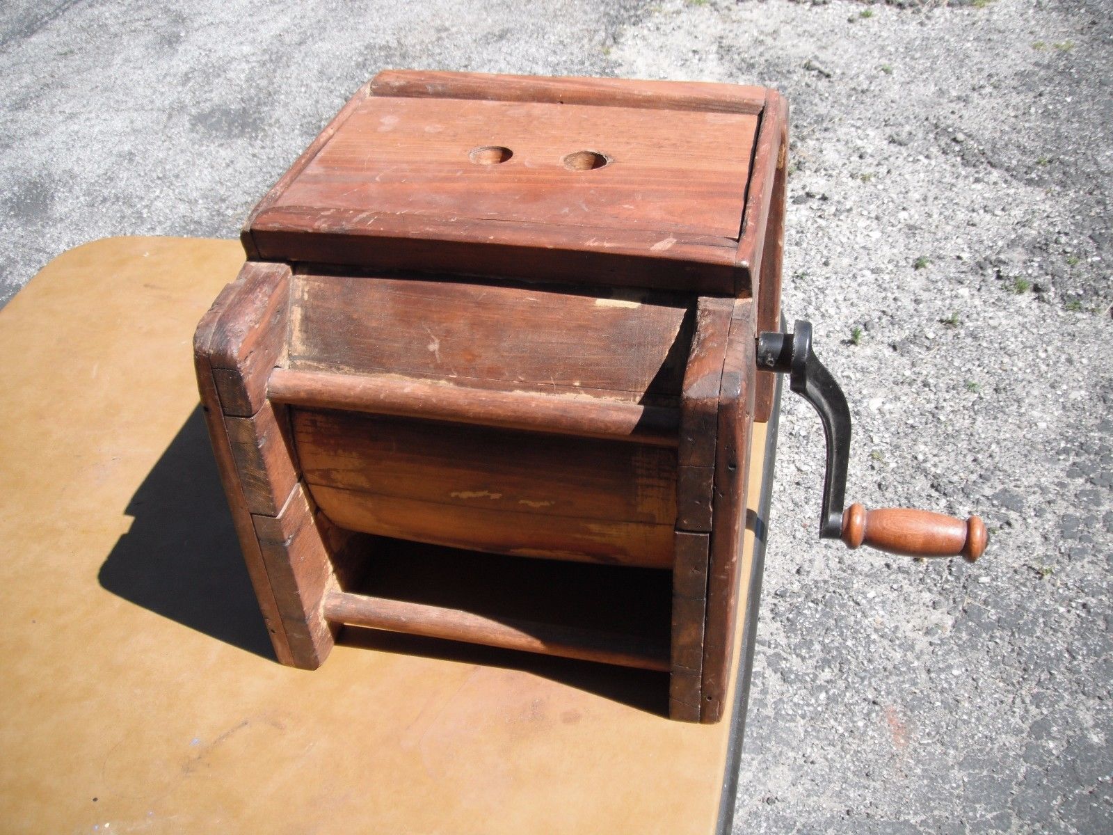 Title (ebay affiliate link): ANTIQUE TABLETOP WOODEN BUTTER CHURN SOME ORIGINAL YELLOW PAINT