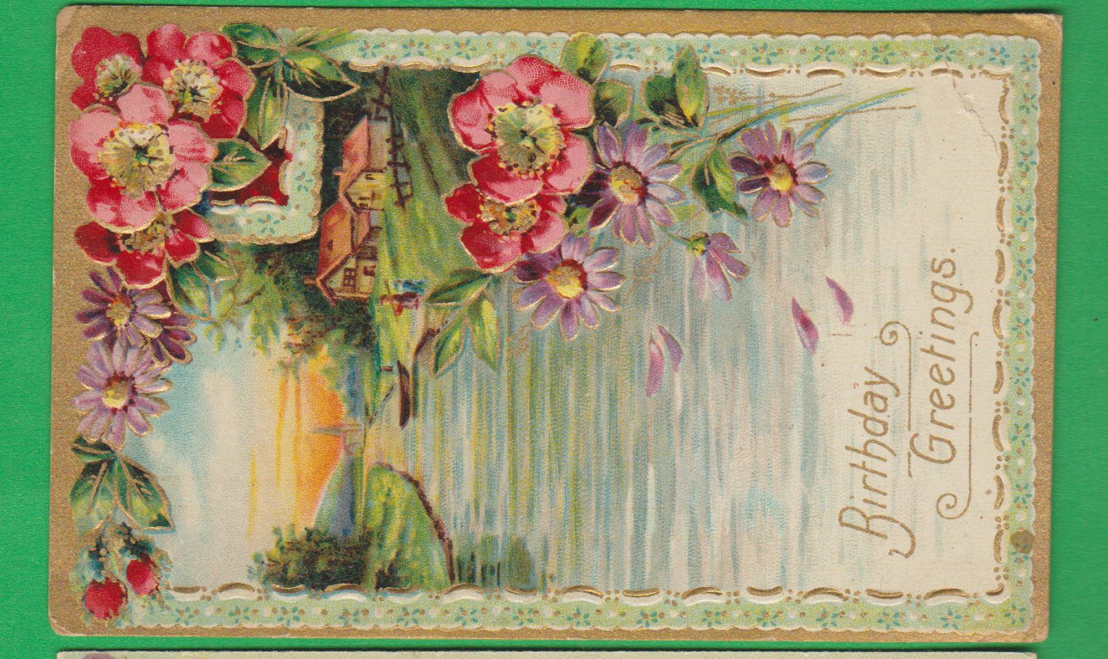Birthday embossed postcard/ wild roses/ daisies/ cottage/ water/ non-linen pc