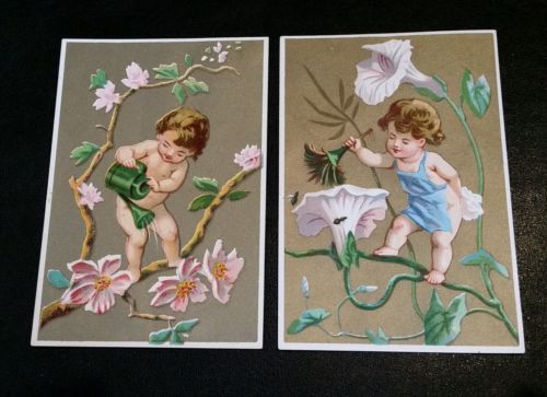 Title (ebay affiliate link): 2 Beautiful Antique Victorian Card Baby Watering Flowers & Baby Dusting Flowers