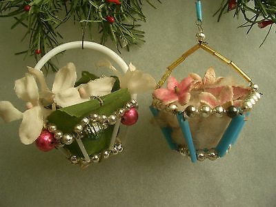 LOT OF 2 Antique Czechoslovakia GLASS BEADED flower basket CHRISTMAS ORNAMENT