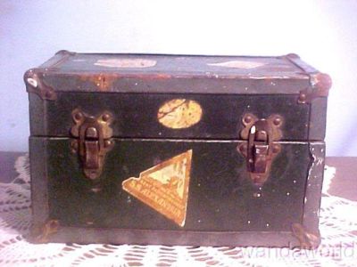 Title (ebay affiliate link): ANTIQUE CHILDS MARY LU METAL DOLL TRUNK W/STICKERS