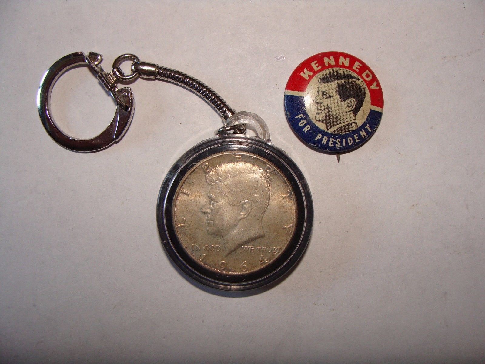 Title (ebay affiliate link): 1964 Silver Kennedy Half Dollar Keychain & Kennedy for President Campaign Button