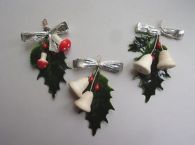 3x Antique German SPUN COTTON BELLS & MUSHROOMS CHRISTMAS ORNAMENTS