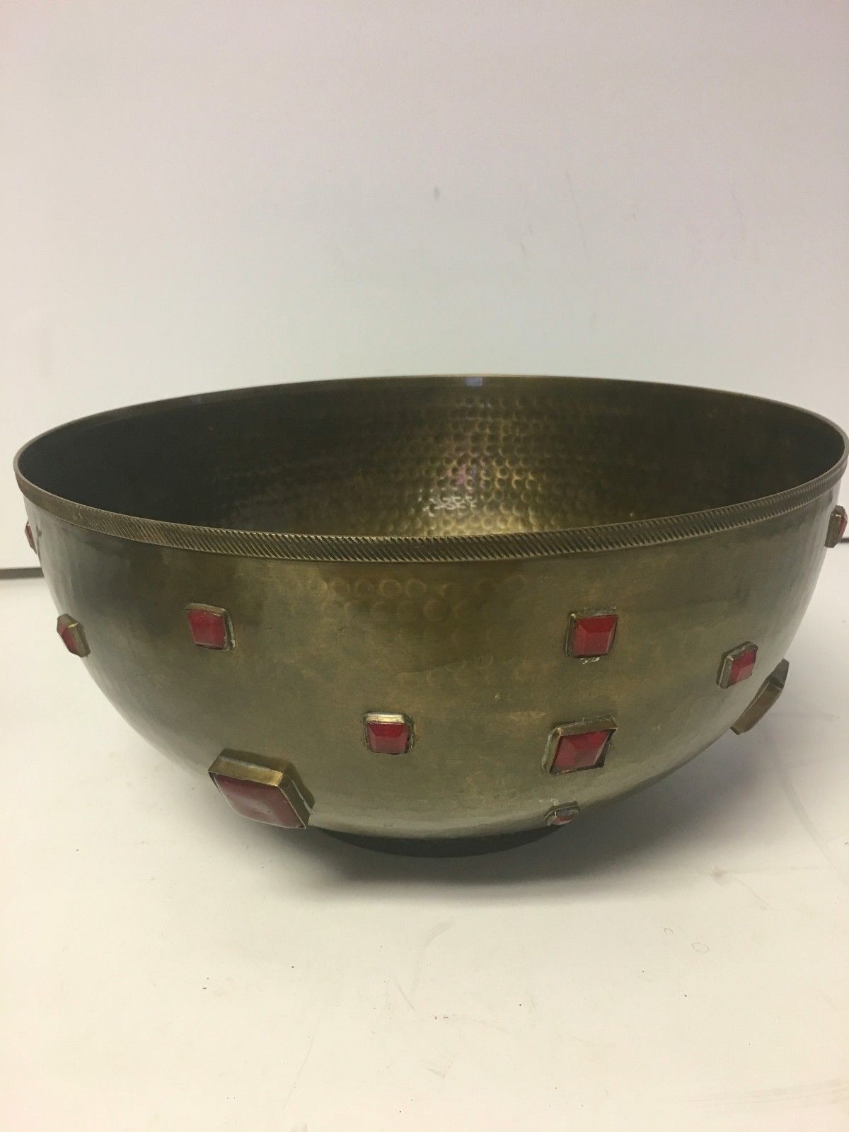 Title (ebay affiliate link): Vintage Jeweled Brass Bowl ICE Bucket BOHO MCM Decor Red Stone Engrave Vessel