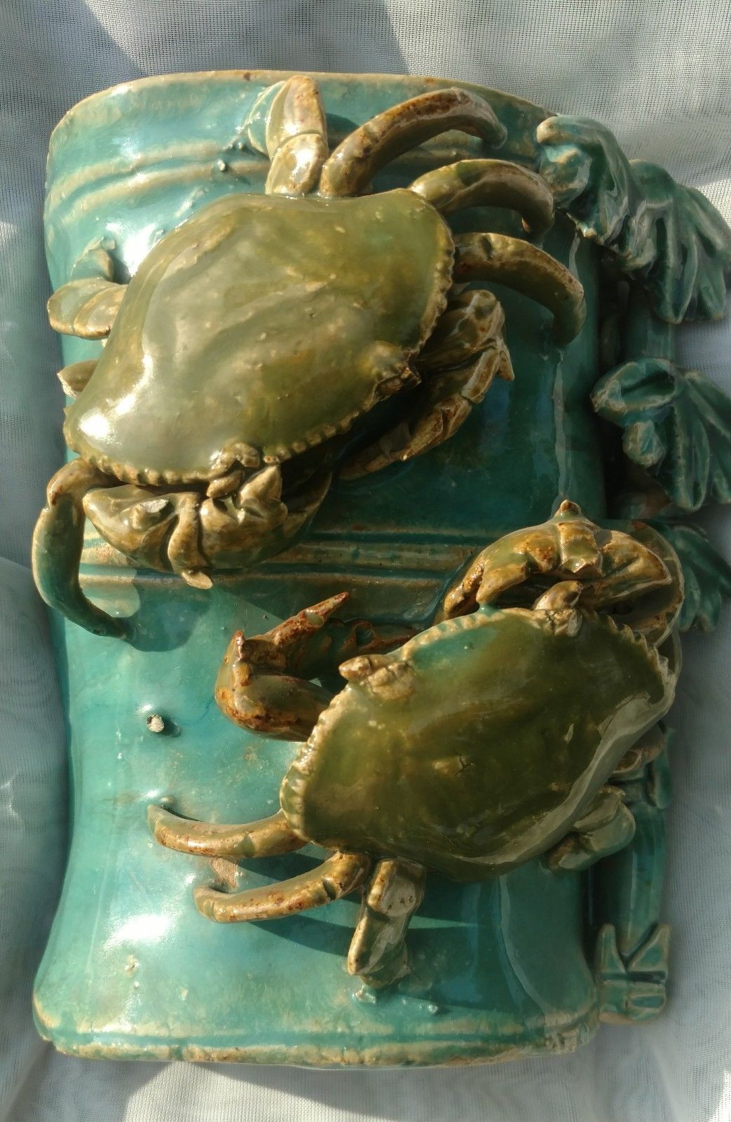 Chinese Green Glaze Wall Pocket with Crabs, heavy Ceramic