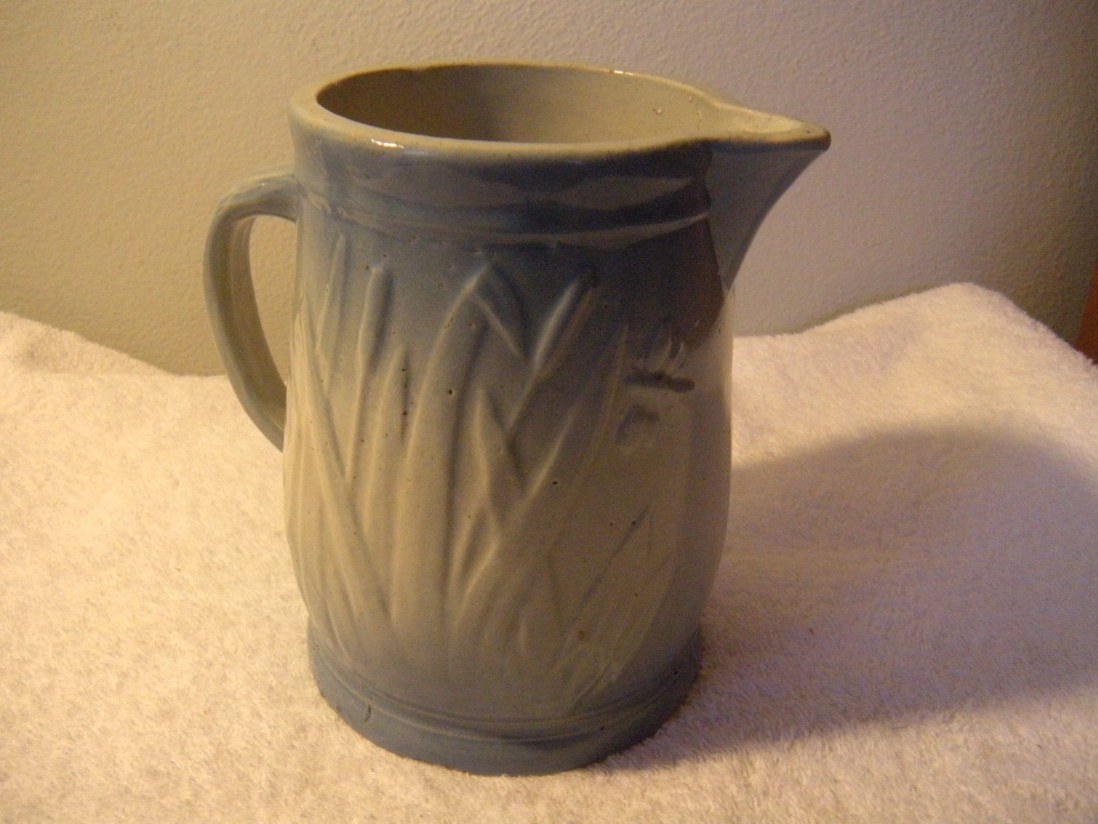 BLUE AND WHITE STONEWARE, PITCHER, CATTAILS, DRAGONFLY