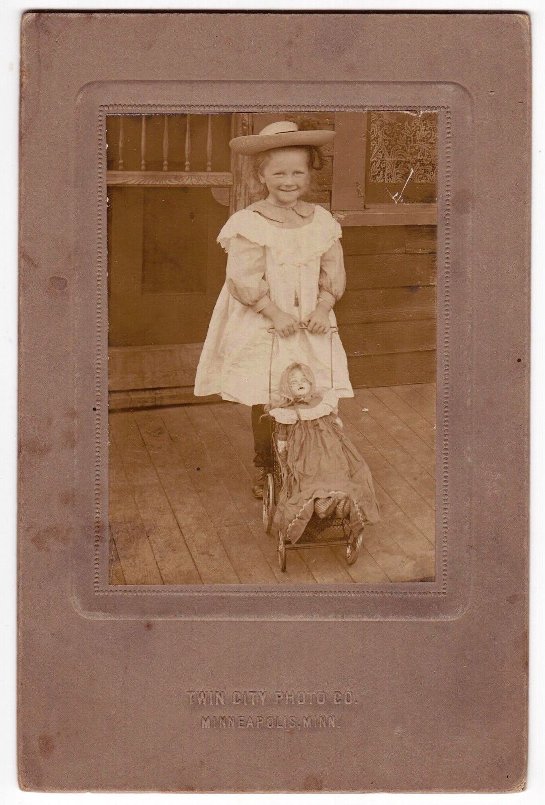 Title (ebay affiliate link): ANTIQUE CABINET CARD PHOTO LITTLE GIRL WITH DOLL IN STROLLER MINNEAPOLIS
