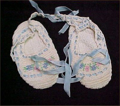 Title (ebay affiliate link): Vintage Antique BABY Doll Shoes Hand Crocheted Ribbons Ties Flower Embroidery