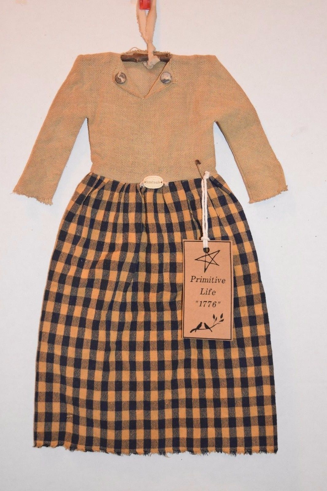 PRIMITIVE COLONIAL GRUNGY FOLK ART DECOR DOLL WALL DRESS VINTAGE HOMESPUN 14"