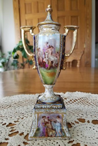 Antique Austria Mantel Urn 7.75" T Roman Women Scene Gold Accents