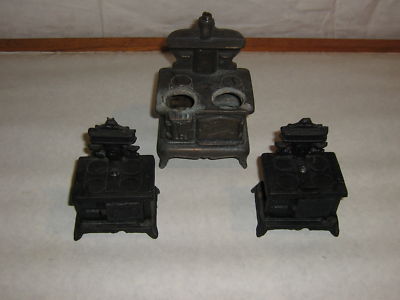 3 TOY STOVES 2 CAST IRON DOT COIN BANKS & 1 BRASS ACME