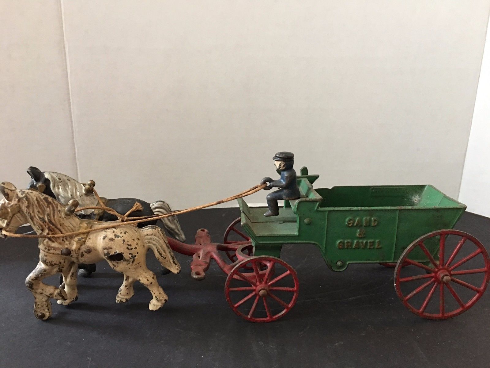 Title (ebay affiliate link): Estate Find Early ARCADE CAST IRON SAND AND GRAVEL WAGON WITH HORSES AND DRIVER