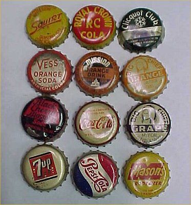 Title (ebay affiliate link): 12 Vintage Antique Bottle Caps Soda Pop Big Chief Vess Orange Squirt Coke + Cork
