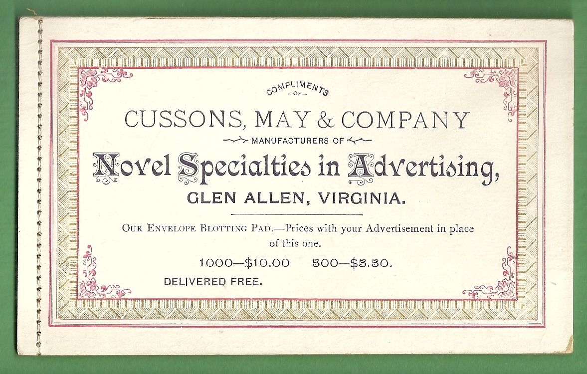 1900 Advertising Blotter Samples CUSSONS MAY & CO NOVELTIES GLEN ALLEN VIRGINIA