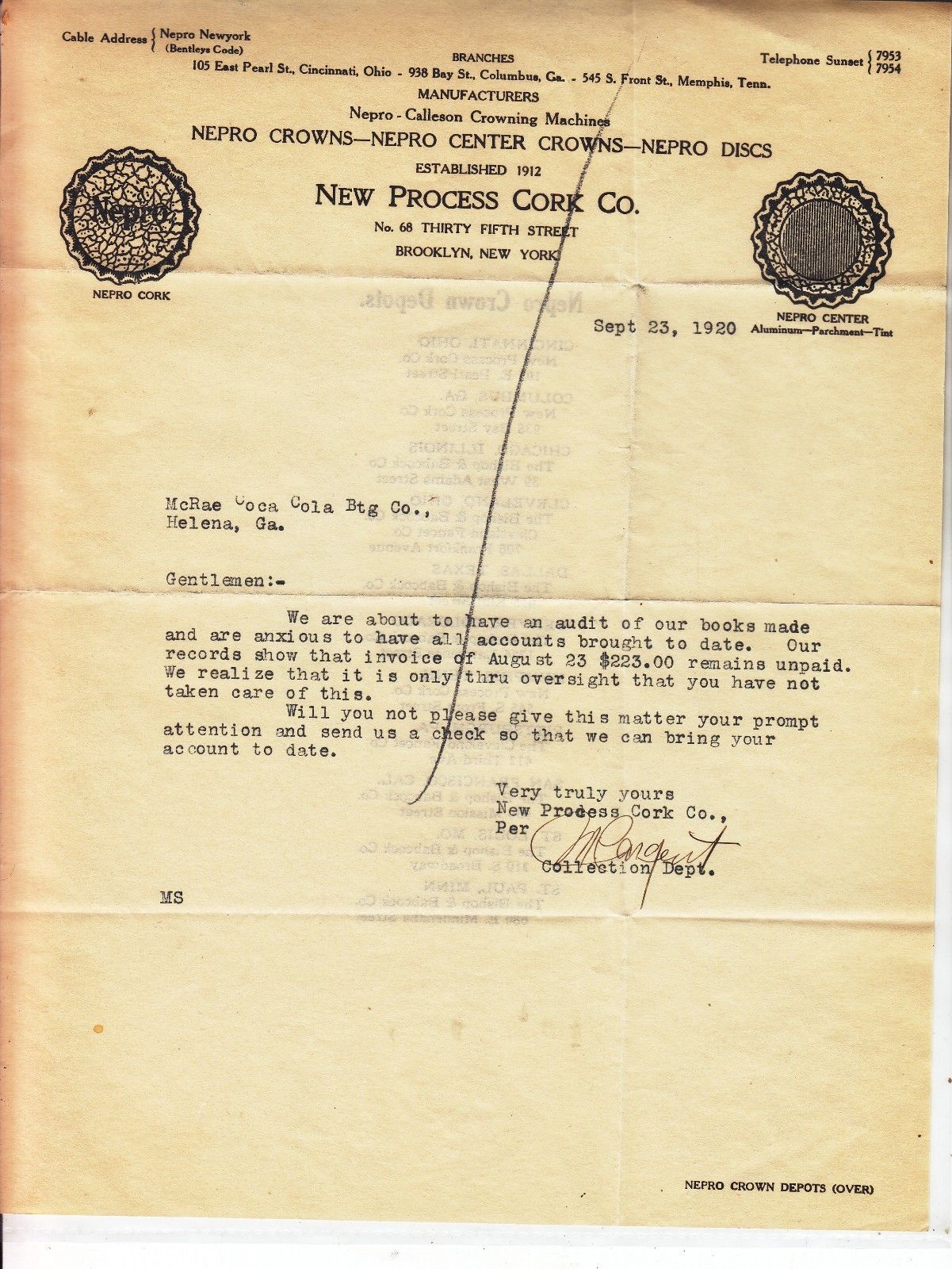NEW PROCESS CORK CO. LETTERHEAD DATED SEPT. 23, 1920 SOLD BOTTLE CAP