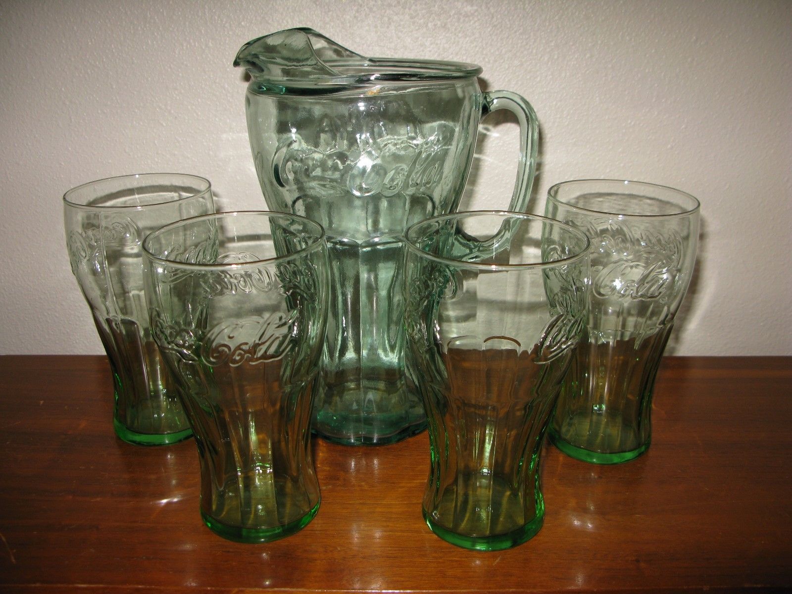 Title (ebay affiliate link): COCA COLA Green Glass Pitcher & 4 Green Tumblers 16 Oz