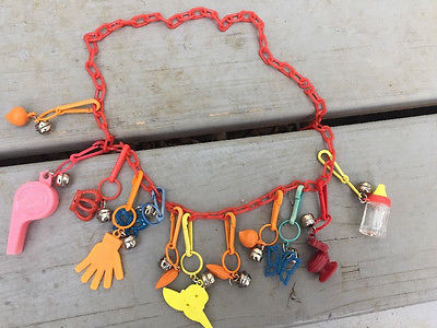 Title (ebay affiliate link): Vintage 80s Bell Charms Necklace Red Bottle Toilet Whistle Hand Hat