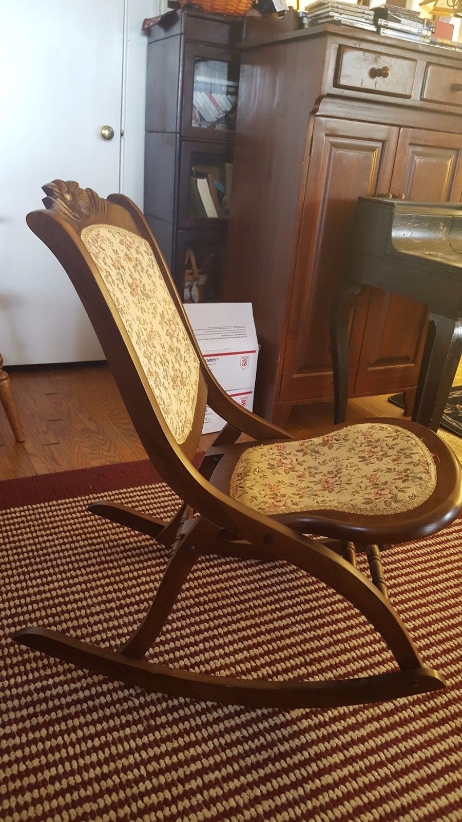Title (ebay affiliate link): Vintage Wood Folding Rocker Rocking Chair with Tapestry Fabric
