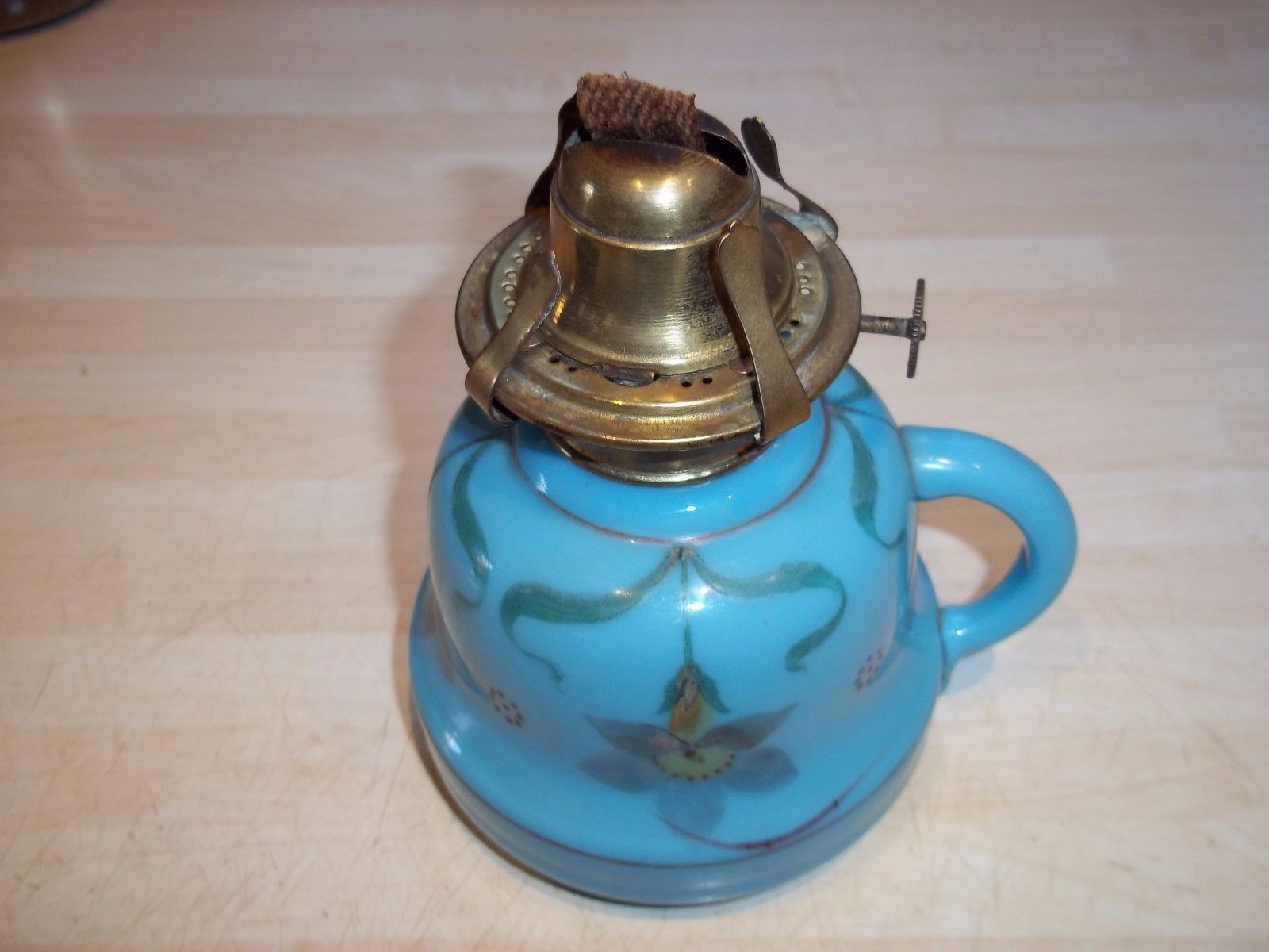 Title (ebay affiliate link): ANTIQUE 19th Centy Victorian HAND PAINTED BLUE MILK GLASS Finger Oil Lamp