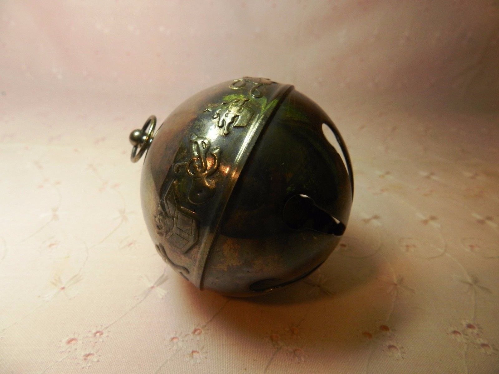 Title (ebay affiliate link): 1974 Wallace silver plate bell ornament 2 1/2" sleigh bell decorated band toys