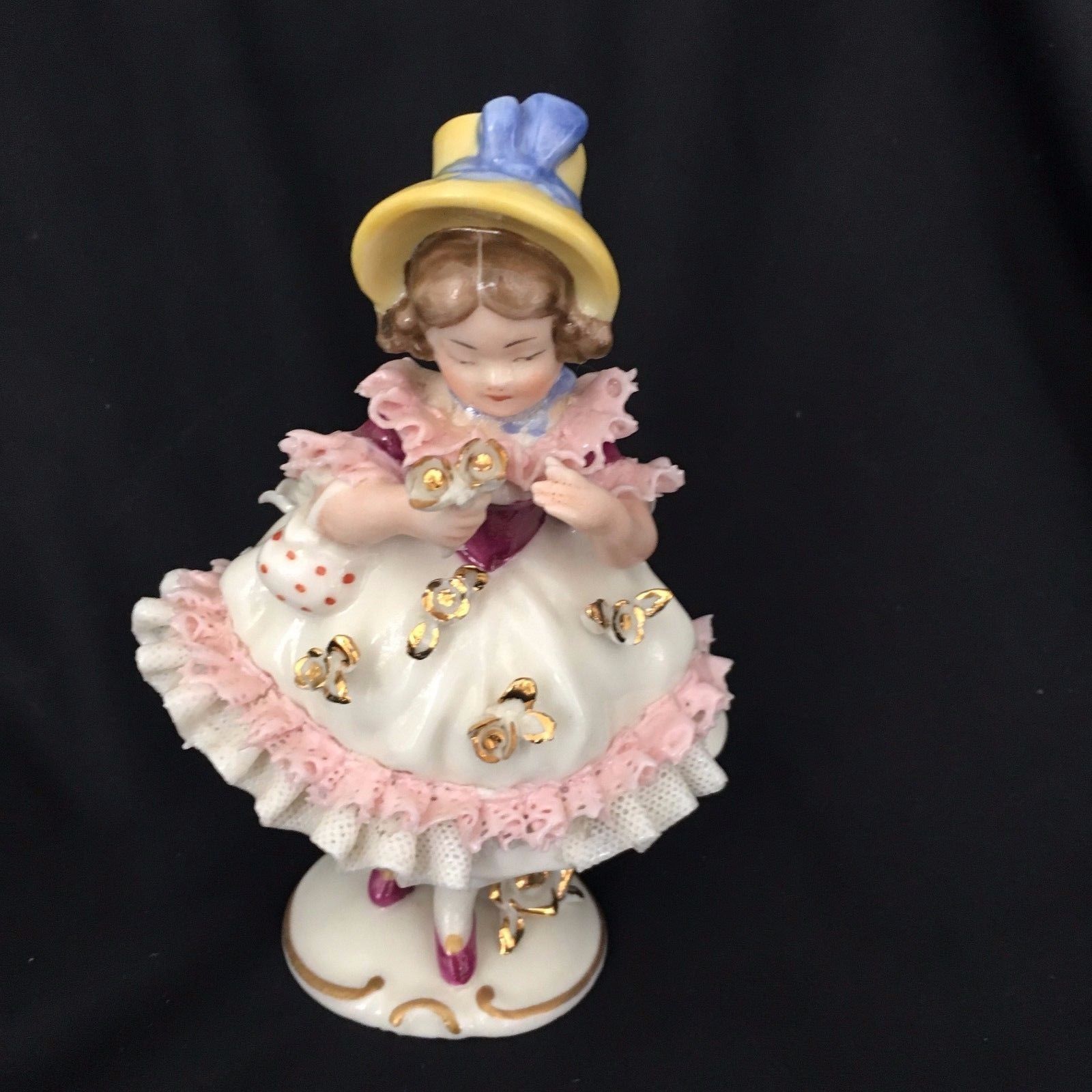 ANTIQUE DRESDEN Lace FRANKENTHAL Germany PORCELAIN GIRL WITH FLOWERS FIGURINE 6"