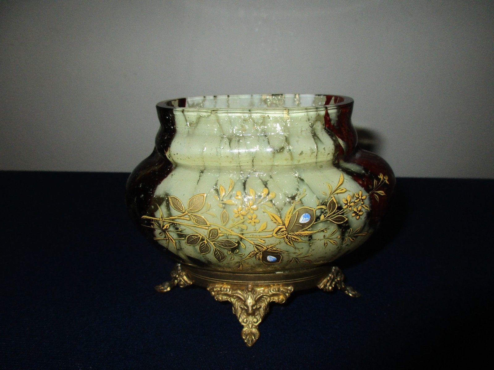 Title (ebay affiliate link): Antique Harrach Loetz Art Glass Oxblood Red Mica Enamel Bronze Dore Footed Vase
