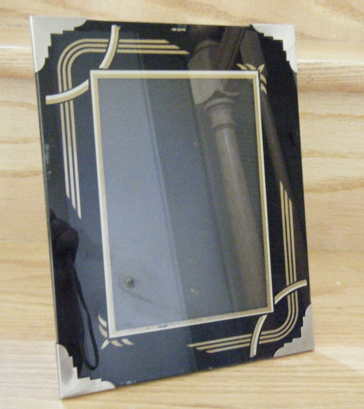 Title (ebay affiliate link): Art Deco Black & Gold Reverse Painted Glass Picture Frame Chrome Corners