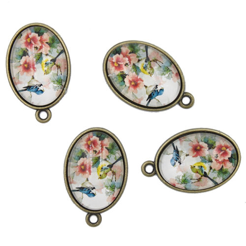 5x Alloy&Glass Oval Pendant Antique Bronze Flower&Birds Patterns Craft On Sale L