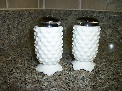 Title (ebay affiliate link): FENTON MARKED MILK GLASS HOBNAIL CROWN EDGE FOOTED SALT AND PEPPER SHAKERS
