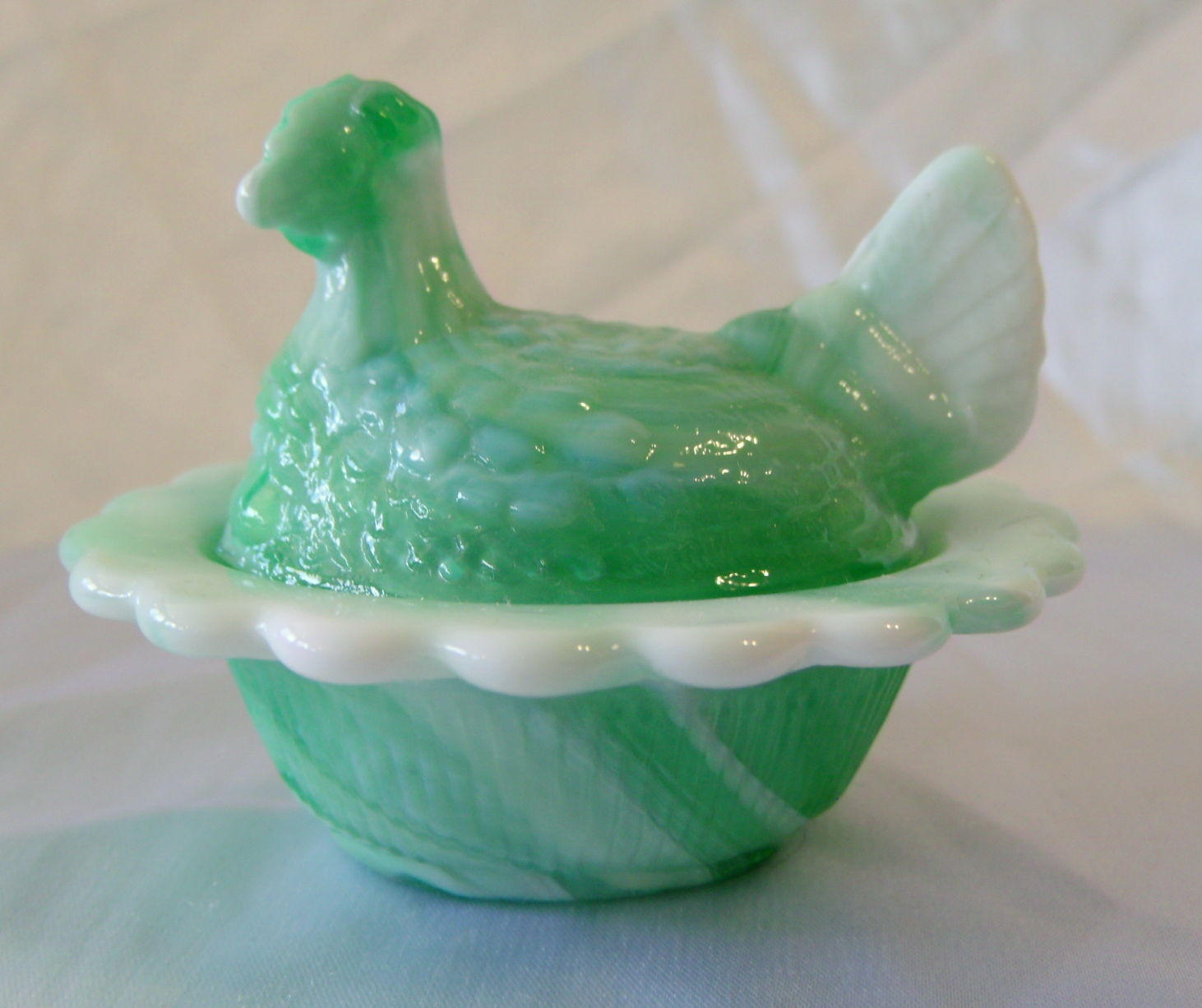 Jadeite Green Slag Milk Glass Hen On Nest Swirls Chick Salt Dish Dip Mosser LOOK