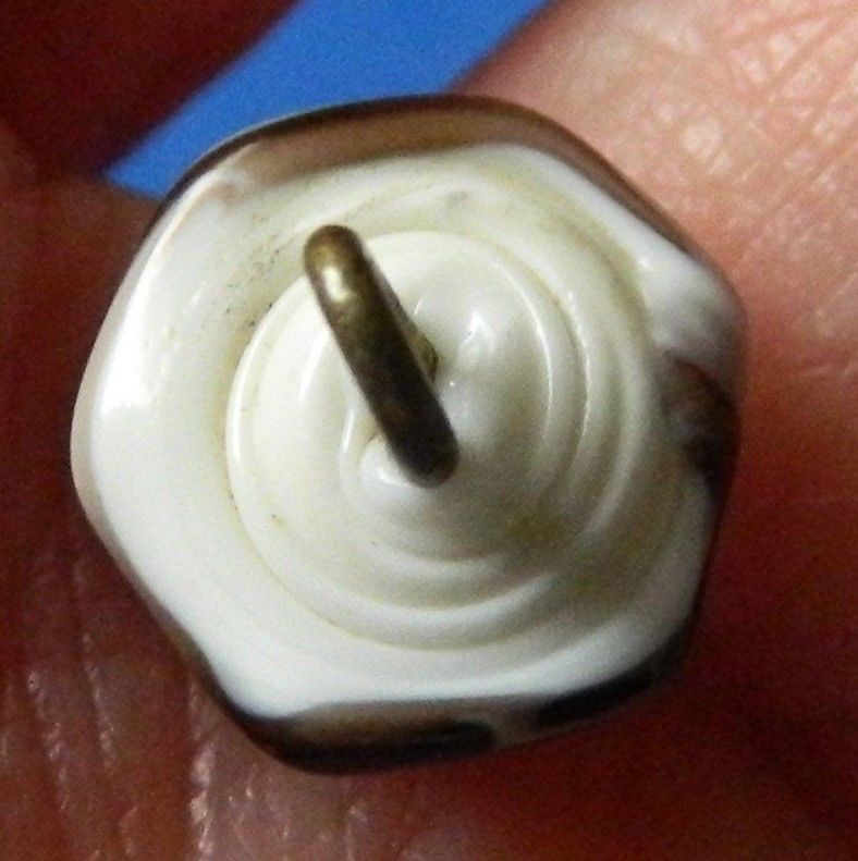 Title (ebay affiliate link): Antique Vtg HEXAGON White Milk Glass CHOCOLATE Swirl Slag CharmString Button