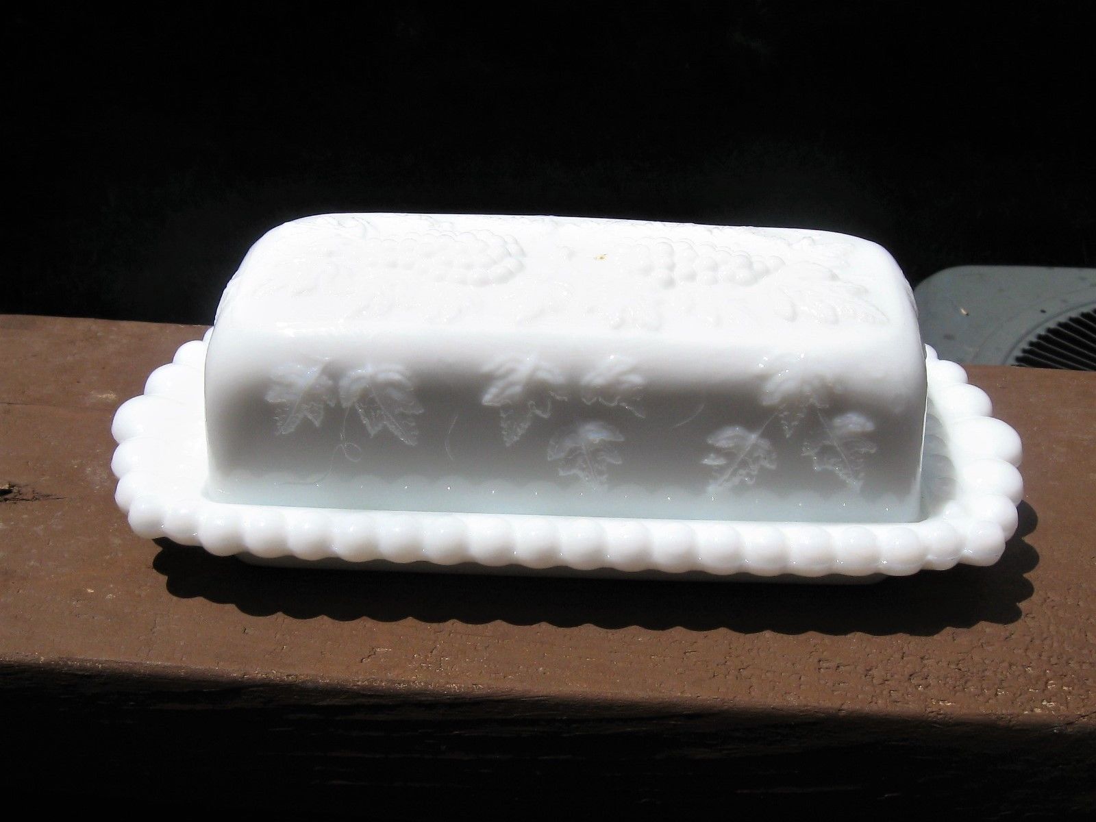 Title (ebay affiliate link): Vintage Milk Glass Butter Dish---Grape and Grape Vine Design..Never Used