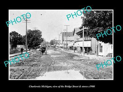 OLD LARGE HISTORIC PHOTO OF CHARLEVOIX MICHIGAN, VIEW OF BRIDGE St & STORES 1900