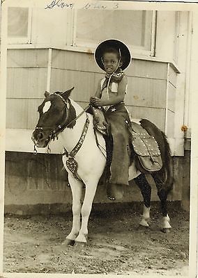 Vtg Snapshot-African American Girl dressed as Cowboy sits on Birthday Pony 1950s