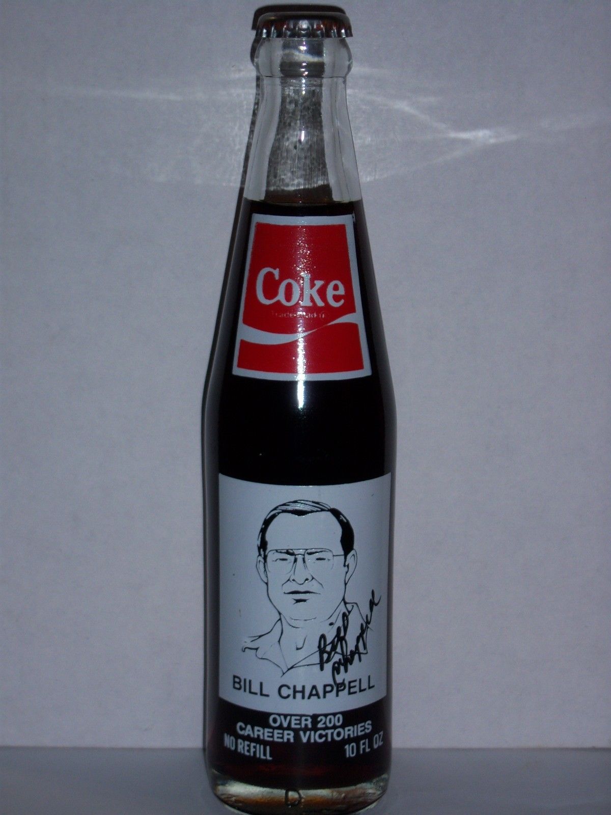 10 OZ COCA COLA COMMEMORATIVE BOTTLE -1986 BILL CHAPPELL 200 VICTORIES AUTOGRAPH