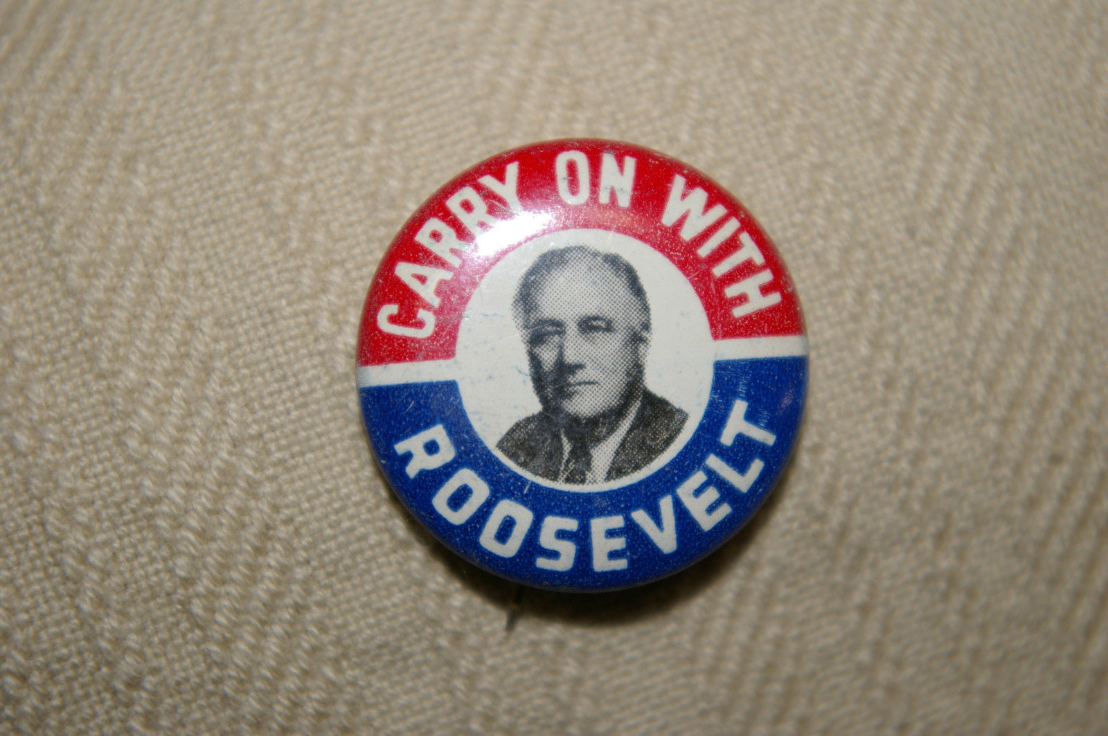Rare Misprint Carry On With ROOSEVELT Picture Campaign Pin 1" Button Geraghty